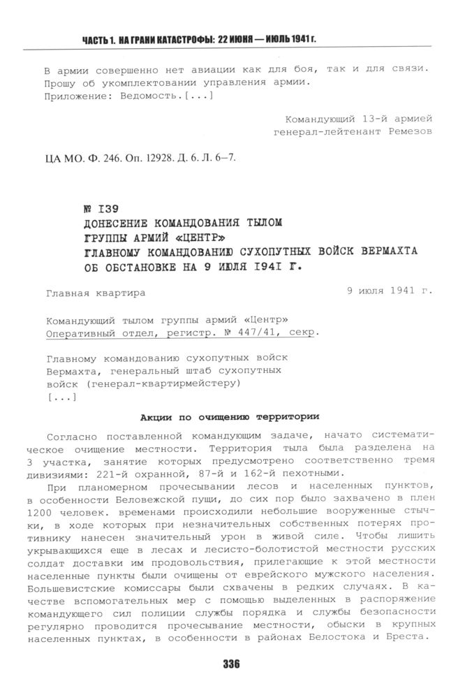 Донесение командования тылом группы армий «Центр» главному командованию сухопутных войск вермахта об обстановке на 9 июля 1941 г. 9 июля 1941 г. // НАРБ. Микрофильм № 239.