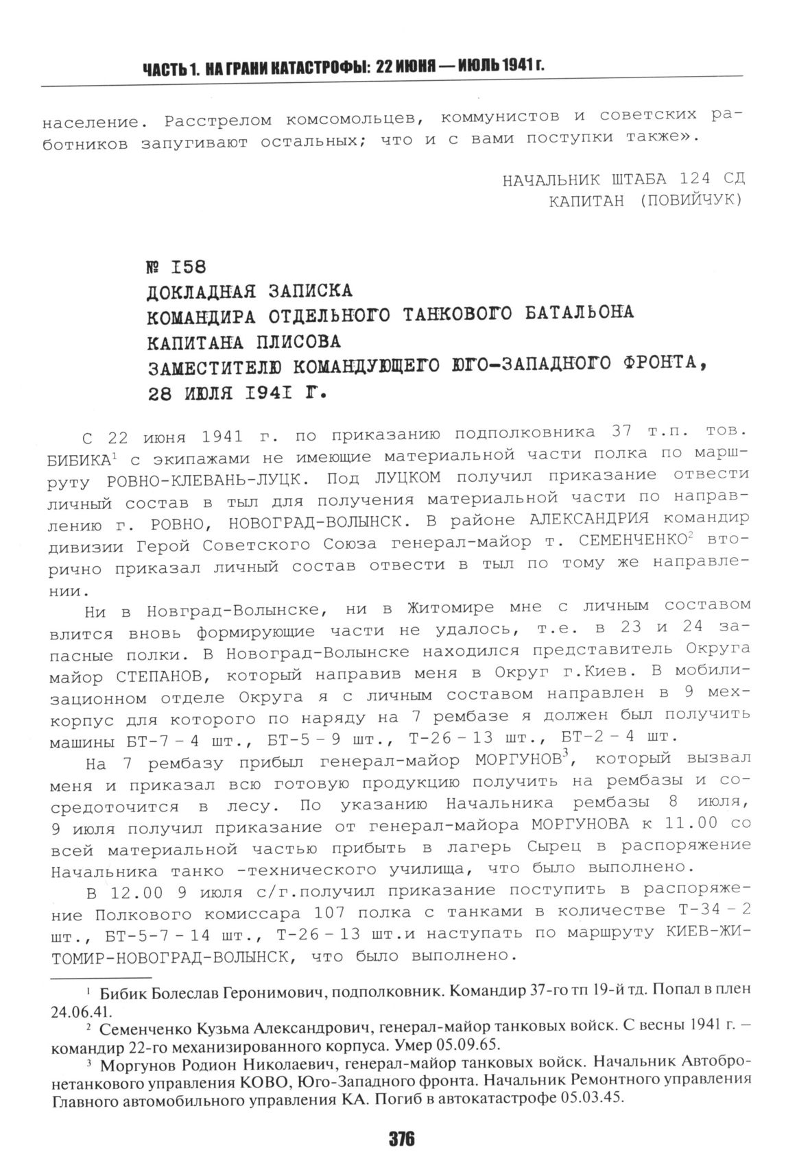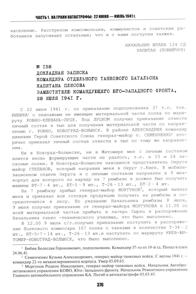 Докладная записка командира отдельного танкового батальона капитана Плисова заместителю командующего Юго-Западного фронта. 28 июля 1941 г. // ЦАМО РФ. Ф. 229. Оп. 157. Д. 7. Т. 1. Лл. 3-5.