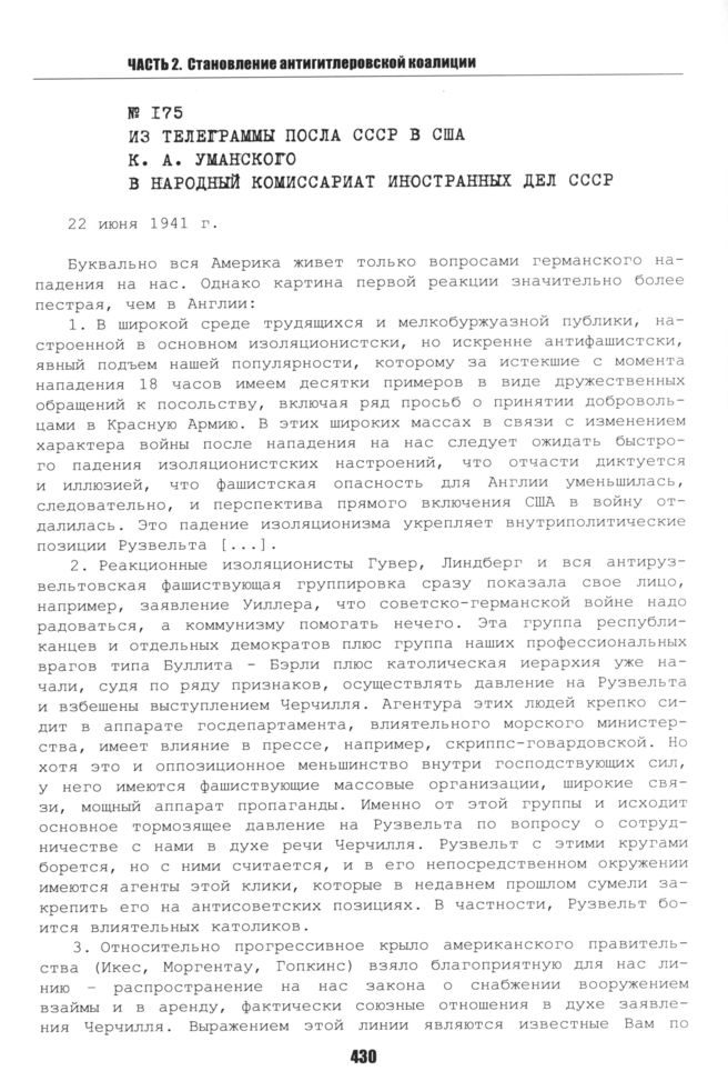 Из телеграммы посла СССР в США К. А. Уманского в народный комиссариат иностранных дел СССР. 22 июня 1941 г. // Советско-американские отношения во время Великой Отечественной войны 1941-1945. М., 1984. Т. 1. С. 42-44.