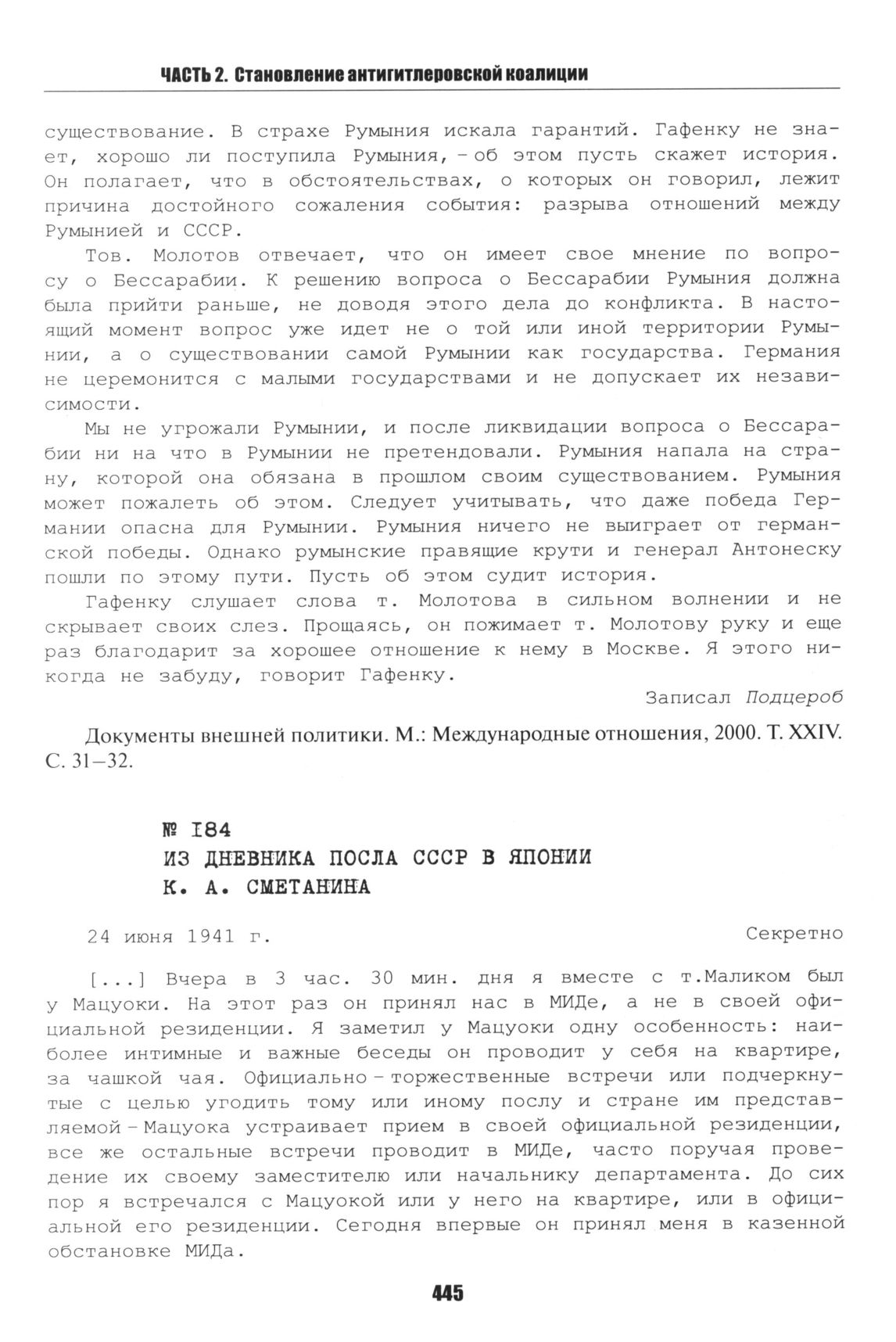 Из дневника посла СССР в Японии К. А. Сметанина. 24 июня 1941 г. // Документы внешней политики. М.: Международные отношения, 2000. Т. XXIV. С. 28-29.