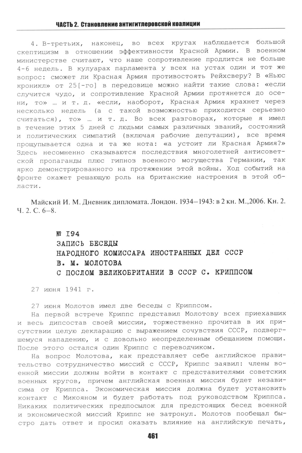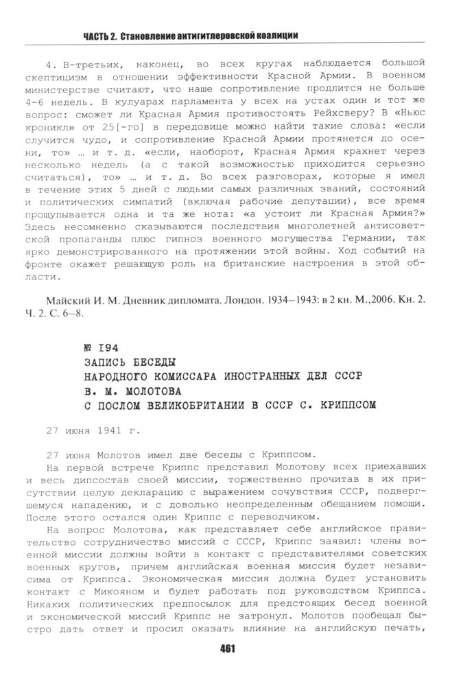 Запись беседы народного комиссара иностранных дел СССР В. М. Молотова с послом Великобритании в СССР С. Криппсом. 27 июня 1941 г. // Документы внешней политики. М.: Международные отношения, 2000. Т. XXIV. С. 46-50.