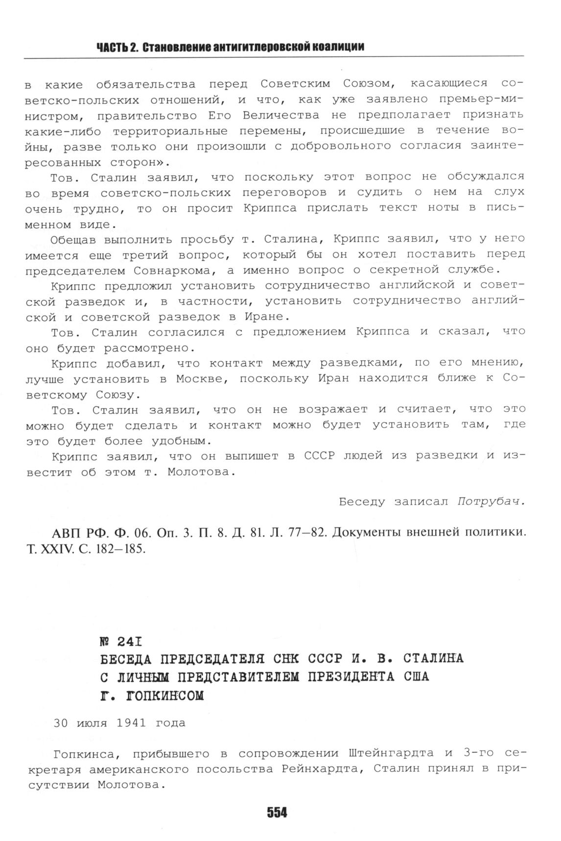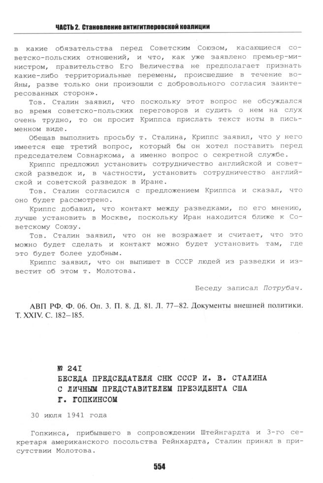Беседа Председателя СНК СССР И. В. Сталина с личным представителем президента США Г. Гопкинсом. 30 июля 1941 года // АВП РФ. Ф. 06. Оп. 3. П. 21. Д. 288. Л. 5—9. Документы внешней политики. Т. XXIV. С. 198-200.