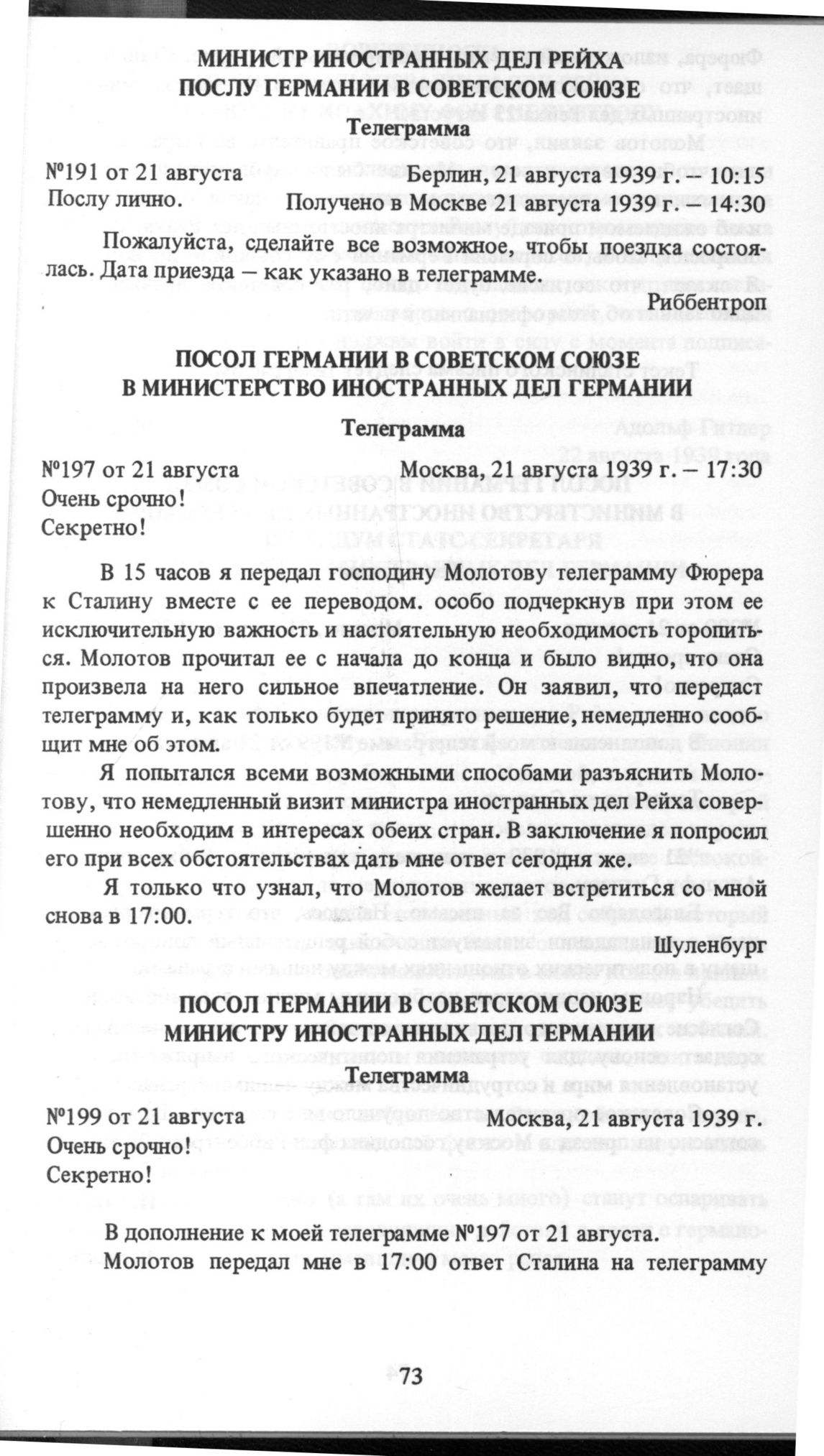 Посол Германии в Советском Союзе в Министерство иностранных дел Германии. Телеграмма №197. Москва, 21 августа 1939 г.