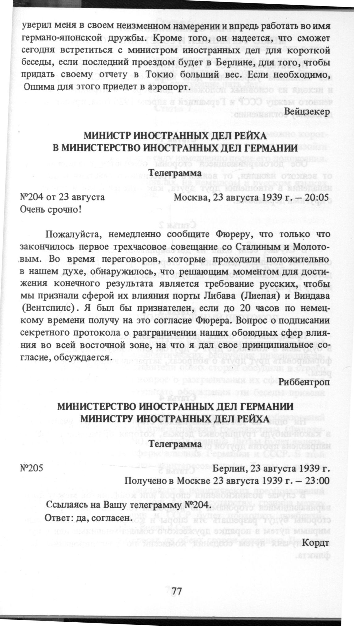 Министр иностранных дел Рейха в Министерство иностранных дел Германии. Телеграмма №204. Москва, 23 августа 1939 г.