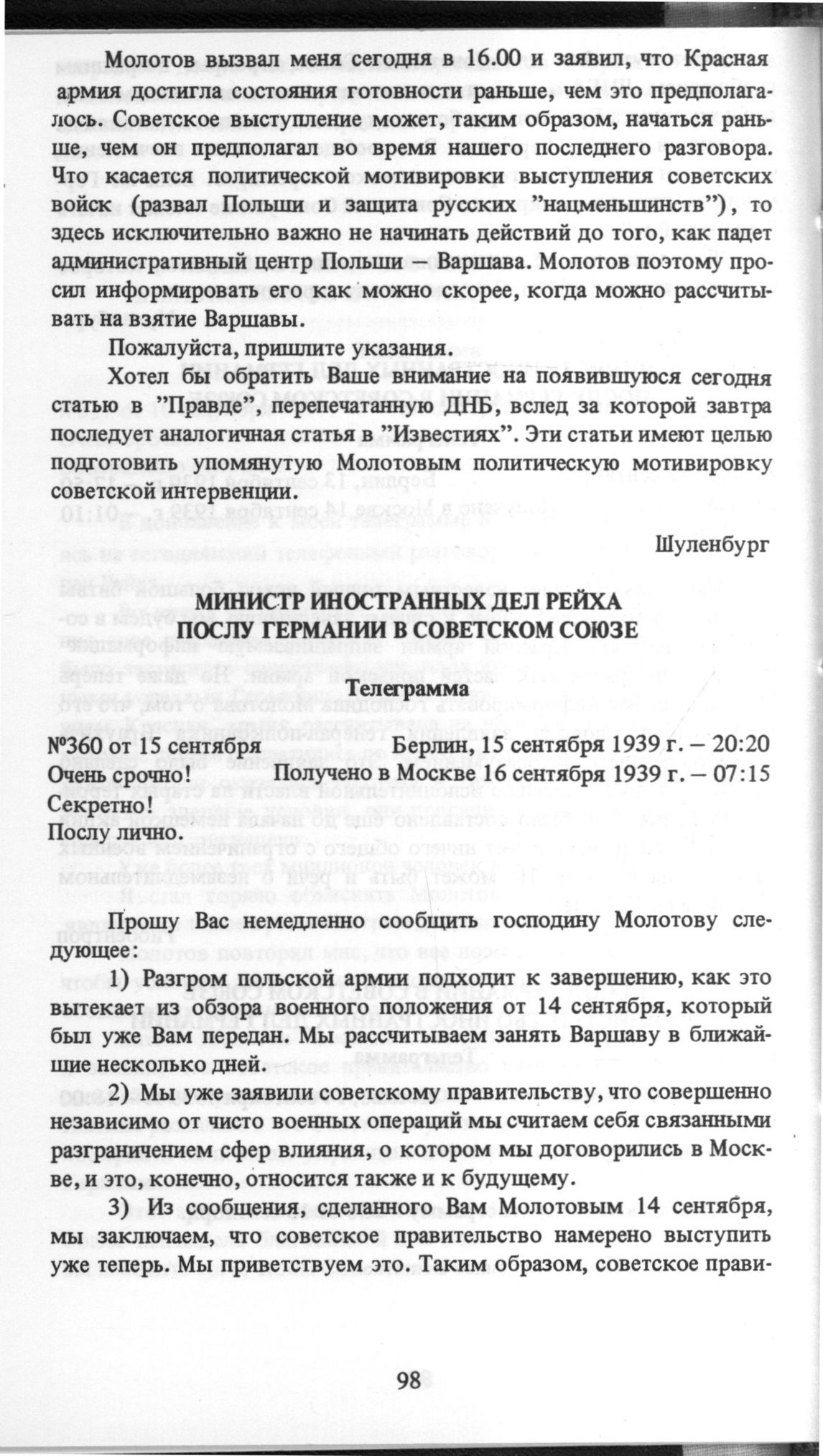 Министр иностранных дел Рейха послу Германии в Советском Союзе. Телеграмма №360. Берлин, 15 сентября 1939 г.