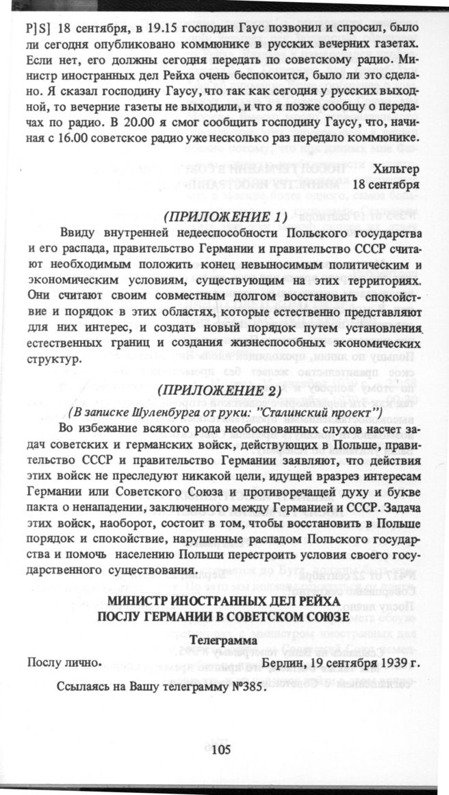 Министр иностранных дел Рейха послу Германии в Советском Союзе. Телеграмма. Берлин, 19 сентября 1939 г.