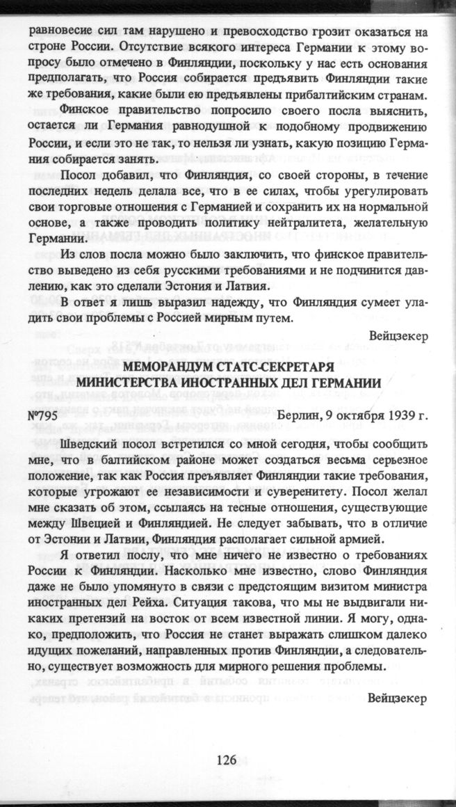 Меморандум статс-секретаря Министерства иностранных дел Германии. №795. Берлин, 9 октября 1939 г.