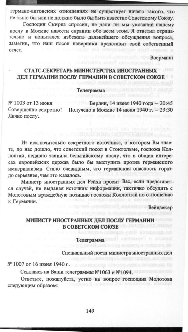 Статс-секретарь Министерства иностранных дел Германии послу Германии в Советском Союзе. Телеграмма № 1003. От 13 июня 1940 г.