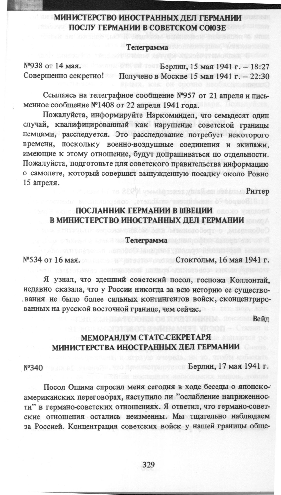 Министерство иностранных дел Германии послу Германии в Советском Союзе. Телеграмма №938. От 14 мая 1941 г.