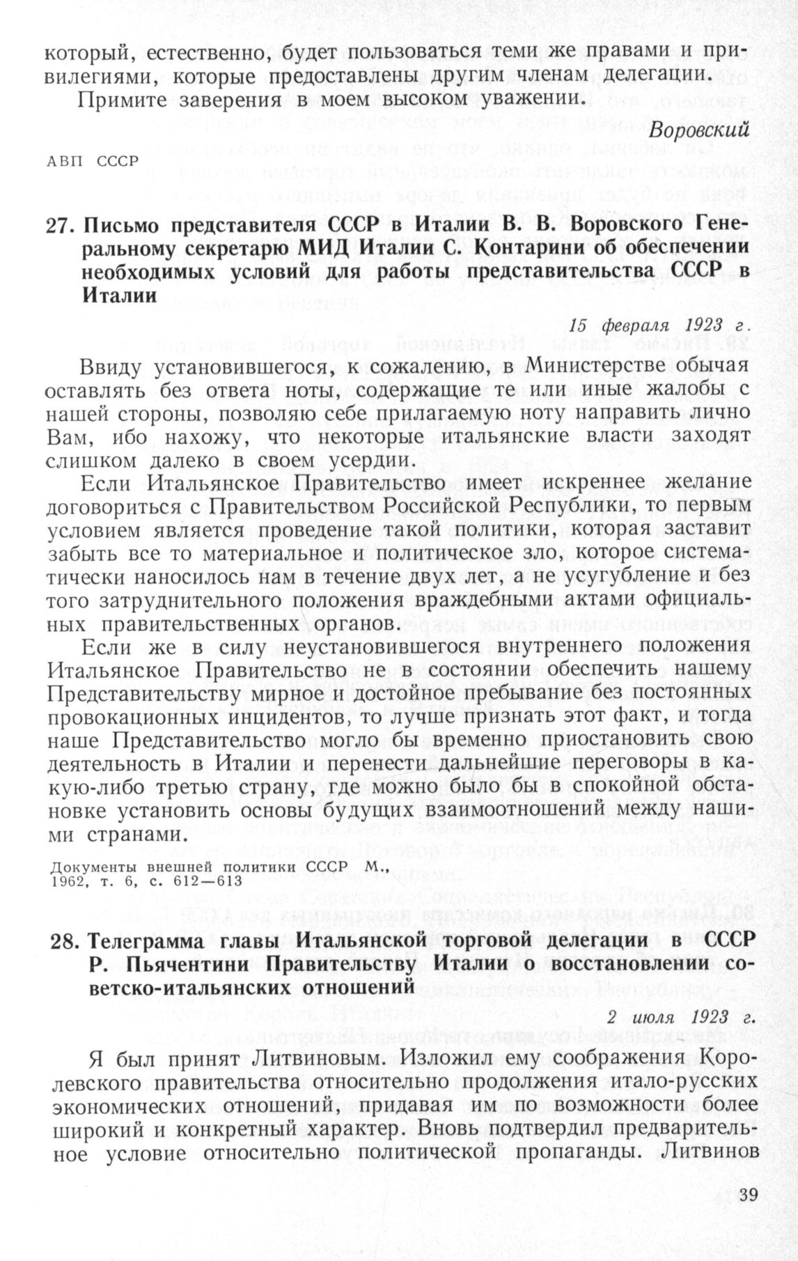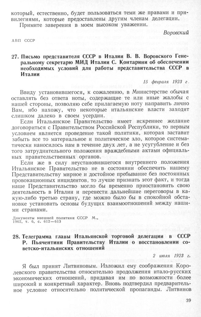 Письмо представителя СССР в Италии В.В. Воровского Генеральному секретарю МИД Италии С. Контарини об обеспечении необходимых условий для работы представительства СССР в Италии. 15 февраля 1923 г. // Документы внешней политики СССР М., 1962, т. 6, с. 612-613.