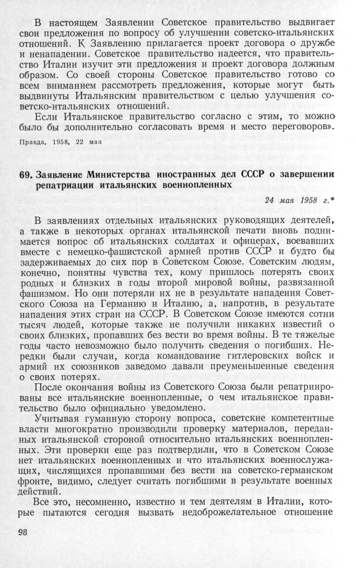 Заявление Министерства иностранных дел СССР о завершении репатриации итальянских военнопленных. 24 мая 1958 г. // Правда, 1958, 24 мая.