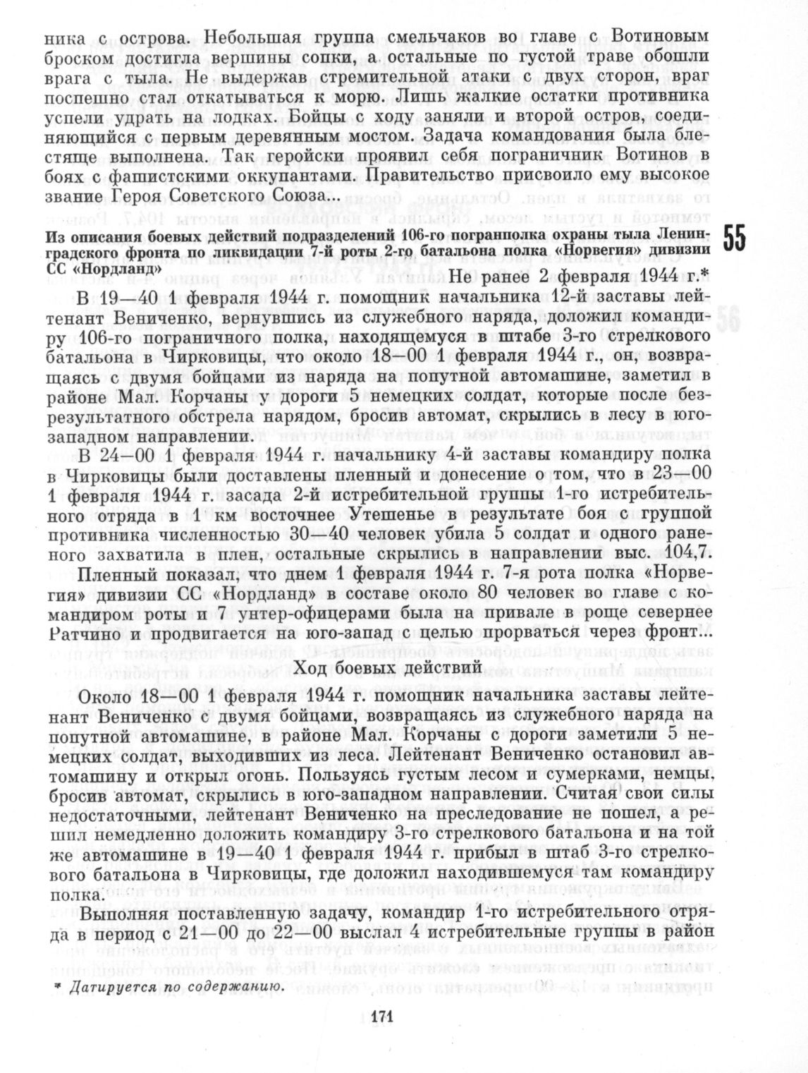 Из описания боевых действий подразделений 106-го погранполка охраны тыла Ленинградского фронта по ликвидации 7-й роты 2-го батальона полка «Норвегия» дивизии СС «Нордланд». Не ранее 2 февраля 1944 г.