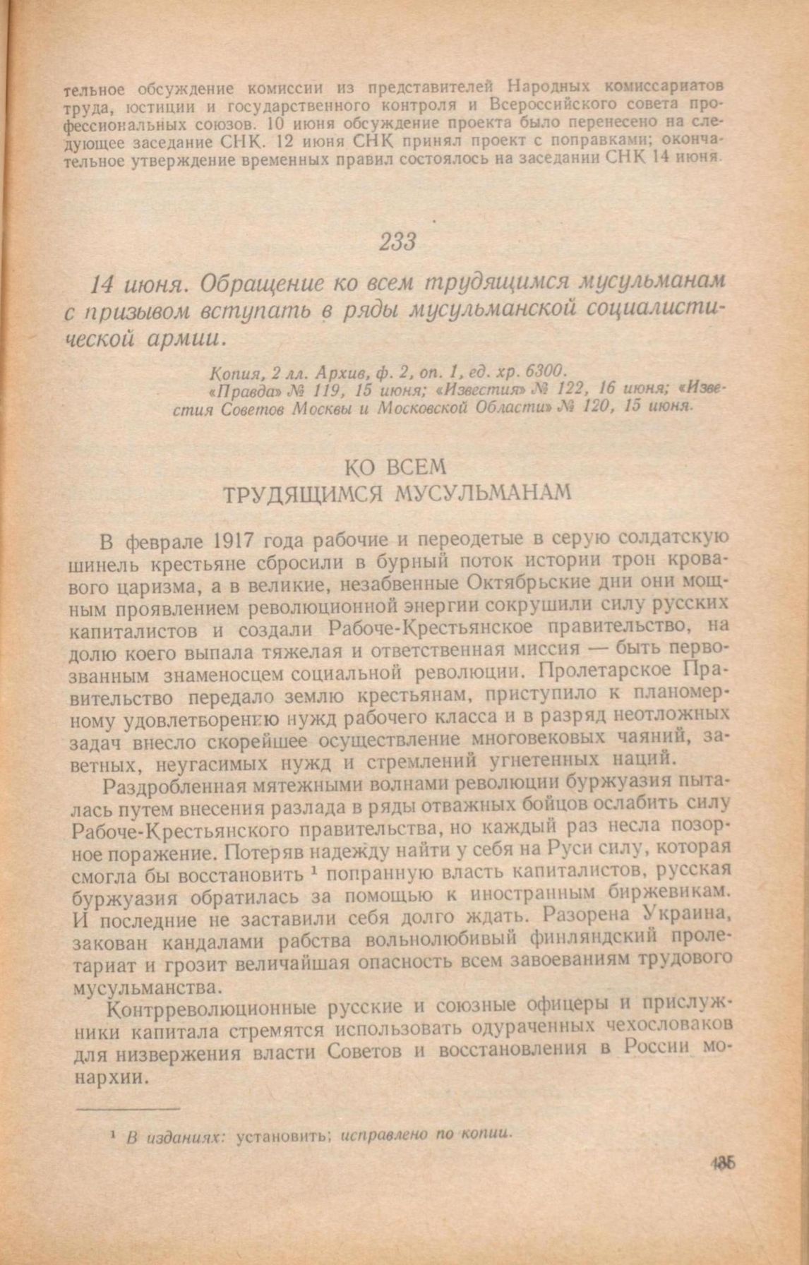 Главная Серия «Экономическая история. Документы, исследования, переводы» Декреты советской власти в 18 т. Декреты Советской власти. Т. II. 17 марта - 10 июля 1918 г. Документы 14 июня. Обращение ко всем трудящимся мусульманам с призывом вступа...