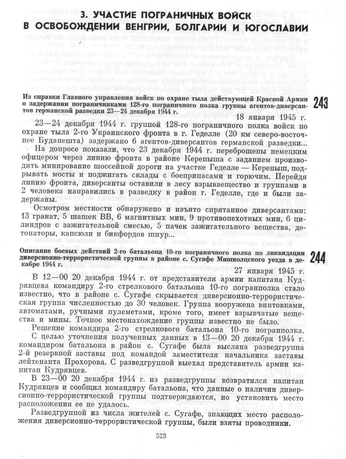 Из справки Главного управления войск по охране тыла действующей Красной Армии о задержании пограничниками 128-го пограничного полка группы агентов-диверсантов германской разведки 23—24 декабря 1944 г. 18 января 1945 г.
