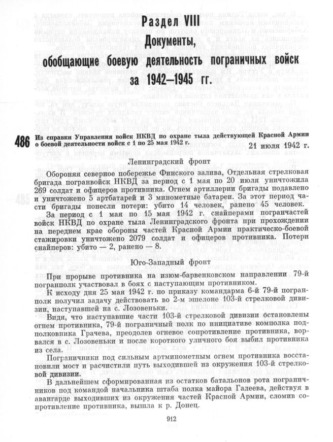 Из справки Управления войск НКВД по охране тыла действующей Красной Армии о боевой деятельности войск с 1 по 25 мая 1942 г. 21 июля 1942 г