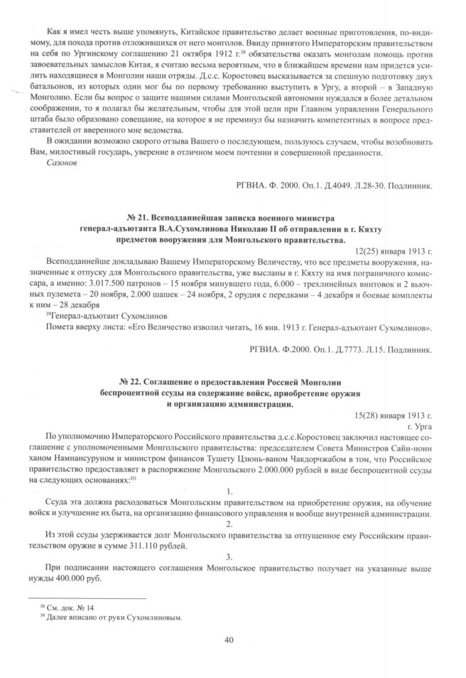 Соглашение о предоставлении Россией Монголии беспроцентной ссуды на содержание войск, приобретение оружия и организацию администрации. 15(28) января 1913 г. // АВПРИ. Ф. Китайский стол. Оп. 491. Д. 677. Л. 27 и об. Зав. копия.