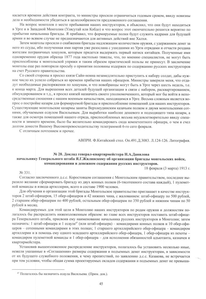 Доклад генерал-квартирмейстера Н.А.Данилова начальнику Генерального штаба Я.Г.Жилинскому об организации бригады монгольских войск, командировании и денежном содержании русских инструкторов. 18 февраля (3 марта) 1913 г.
