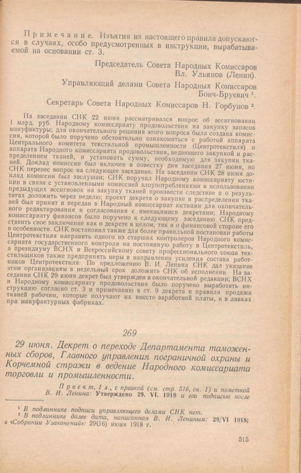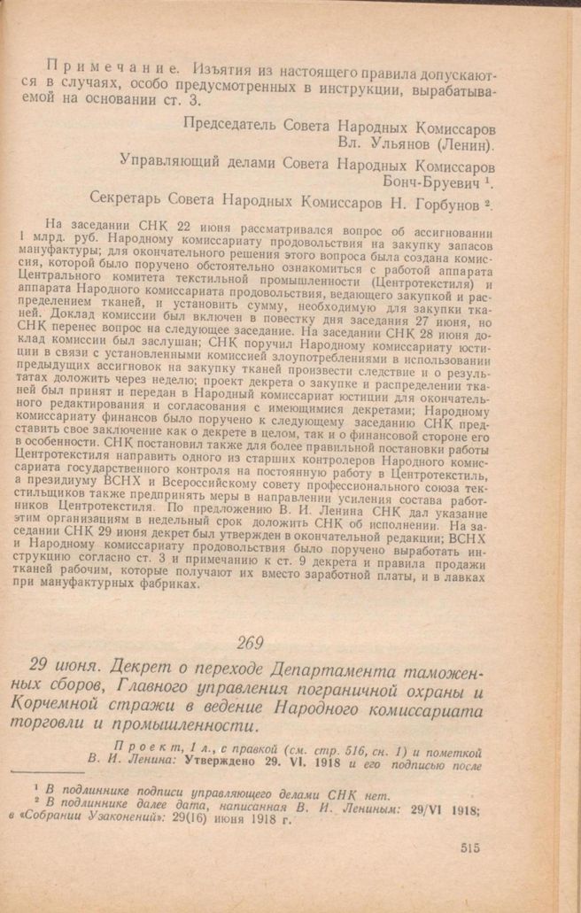 29 июня. Декрет о переходе Департамента таможенных сборов, Главного управления пограничной охраны и Корчемной стражи в ведение Народного комиссариата торговли и промышленности // Проект, 1 л., с правкой (см. стр. 516, сн. 1) и пометкой В. И. Ленина: Утверждено 29. VI. 1918 и его подписью после утверждения в СНК; пометка Н. П. Горбунова: См. протокол № 150. Пункт 8. Архив, ф. 2, оп 1, ед. хр. 6443. Декрет: Копия; пометка: №№ 4932—4934. 2/V11 18 г. Москва. ЦГАОР, ф 130, оп. 2, ед. хр. 52, лл. 10—11. «Известия» № 136, 3 июля; «Собрание Узаконений» № 48, ст. 569.