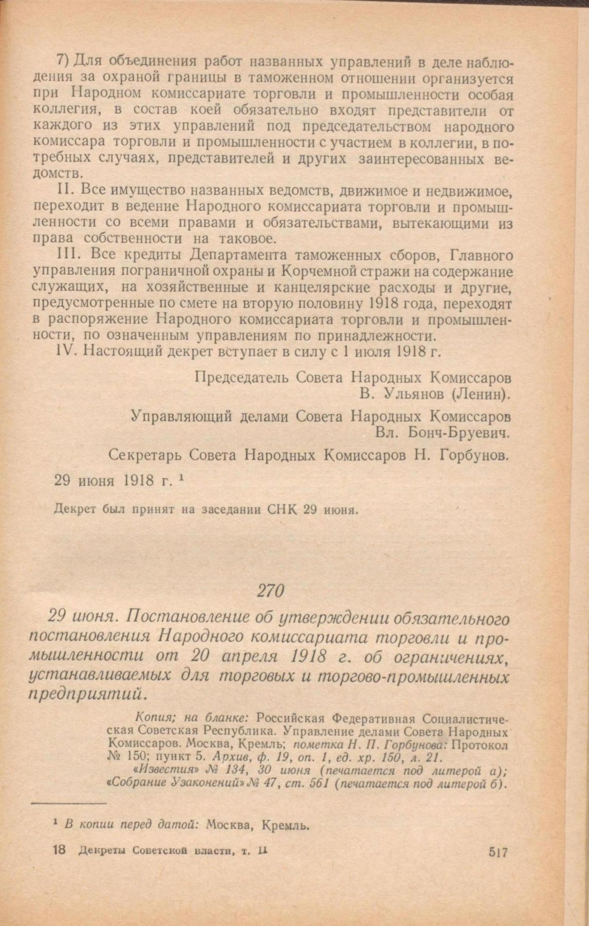 29 июня. Постановление об утверждении обязательного постановления Народного комиссариата торговли и промышленности от 20 апреля 1918 г. об ограничениях, устанавливаемых для торговых и торгово-промышленных предприятий // Копия; на бланке: Российская Федеративная Социалистическая Советская Республика. Управление делами Совета Народных Комиссаров. Москва, Кремль; пометка Н. П. Горбунова: Протокол № 150; пункт 5. Архив, ф. 19, оп. 1, ед. хр. 150, л. 21. «Известия» № 134, 30 июня (печатается под литерой а); Собрание Узаконений» № 47, ст. 561 (печатается под литерой б).
