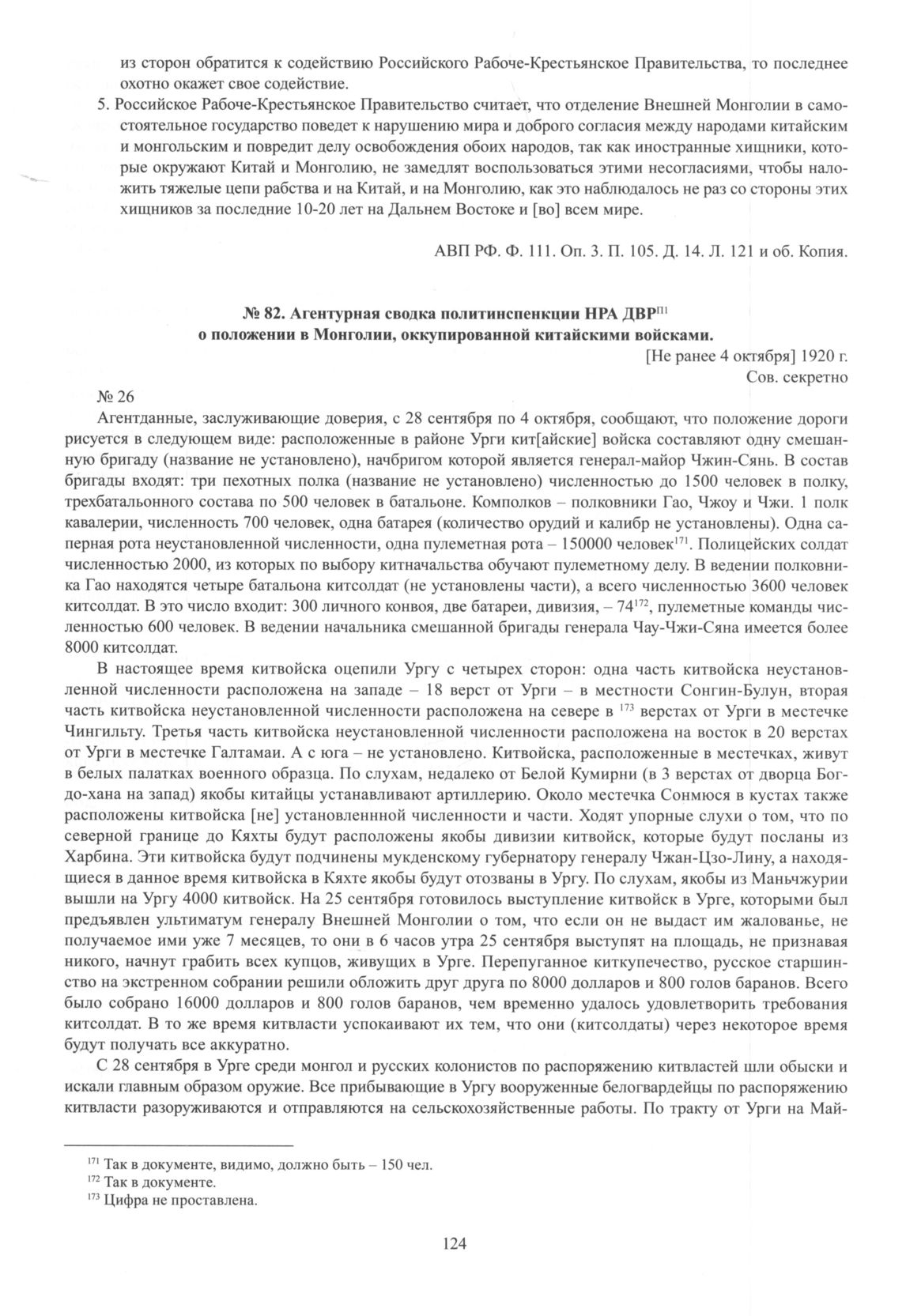 Агентурная сводка политинспенкции НРА ДВРП о положении в Монголии, оккупированной китайскими войсками. [Не ранее 4 октября] 1920 г. // РГАСПИ. Ф. 495. Оп. 152. Д. 2. Л. 14-17. Зав. копия.