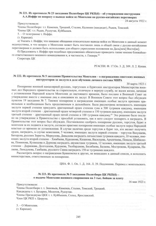Из протокола № 5 заседания Политбюро ЦК РКП(б) - о выдаче Монголии военного снаряжения на 3 тыс. бойцов за плату. 16 мая 1923 г. // РГАСПИ. Ф. 17. Оп. 3. Д. 353. Л. 2. Копия.