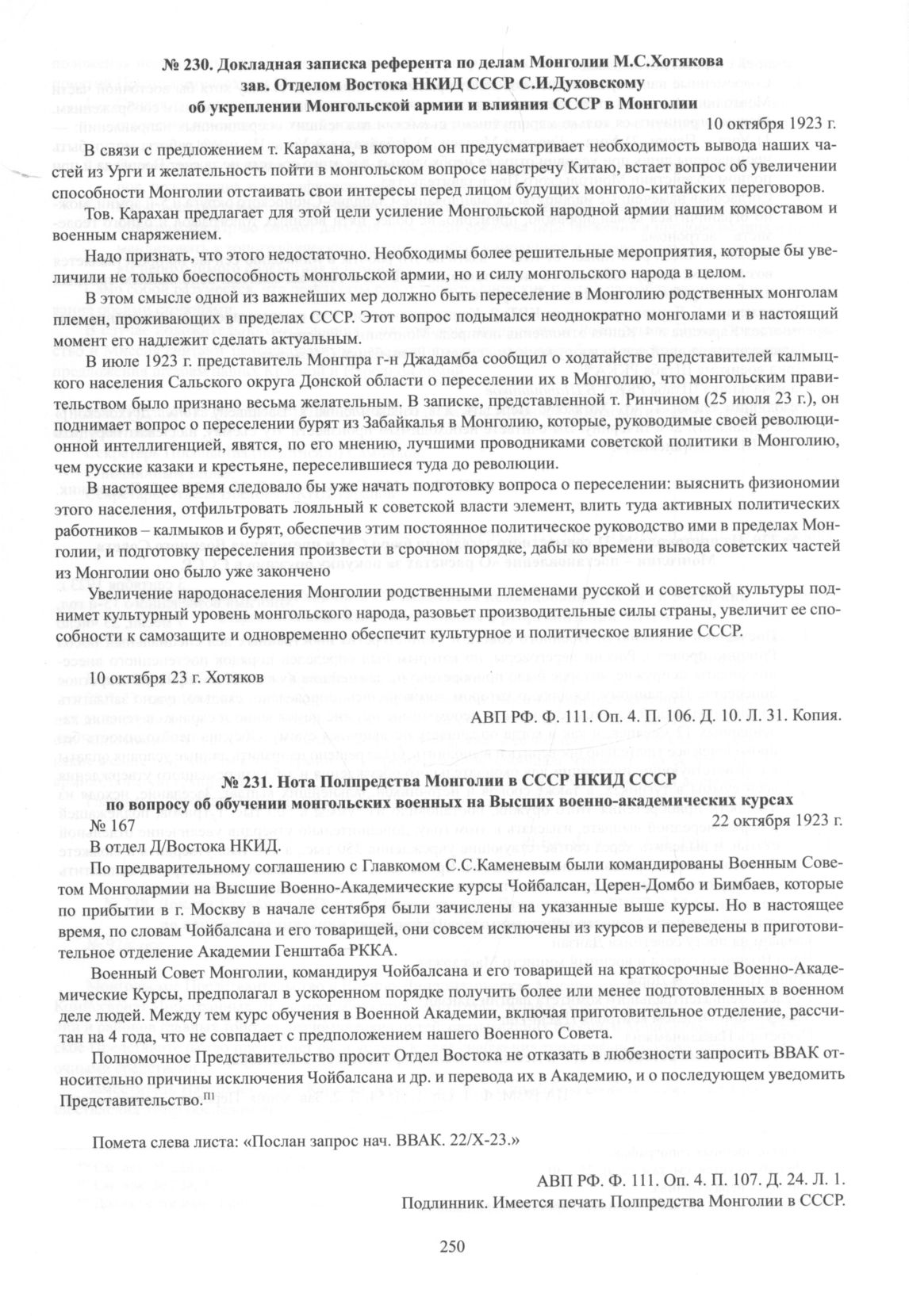 Нота Полпредства Монголии в СССР НКИД СССР по вопросу об обучении монгольских военных на Высших военно-академических курсах. 22 октября 1923 г.