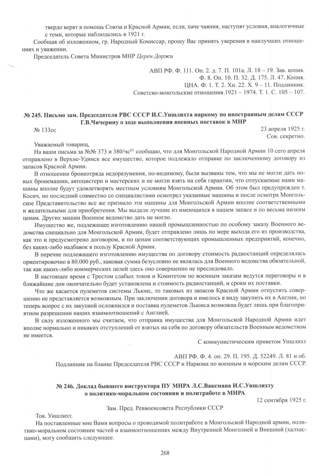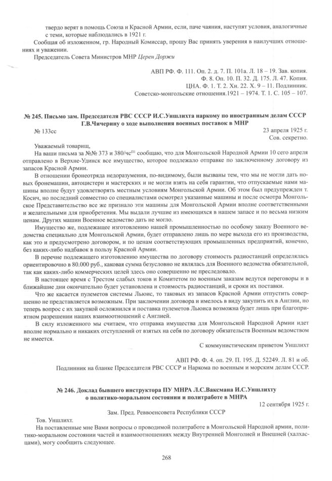 Письмо зам. Председателя РВС СССР И.С.Уншлихта наркому по иностранным делам СССР Г.В.Чичерину о ходе выполнения военных поставок в МНР. 23 апреля 1925 г. // АВП РФ. Ф. 4. Оп. 29. П. 195. Д. 52249. Л. 81 и об. Подлинник на бланке Председателя РВС СССР и Наркома по военным и морским делам СССР.
