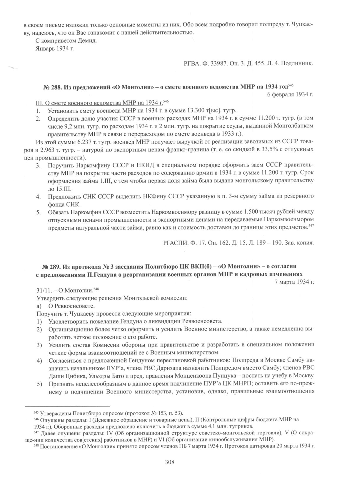 Из протокола № 3 заседания Политбюро ЦК ВКП(б) - «О Монголии» - о согласии с предложениями П.Гендуна о реорганизации военных органов МНР и кадровых изменениях. 7 марта 1934 г.