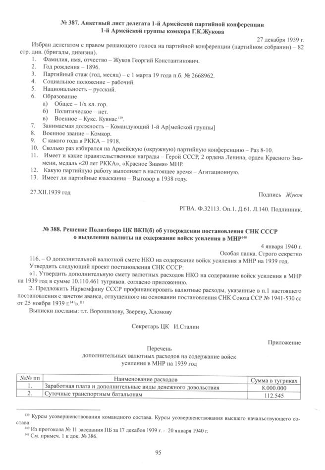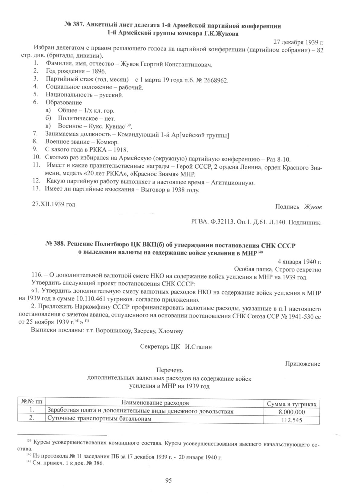 Решение Политбюро ЦК ВКП(б) об утверждении постановления СНК СССР о выделении валюты на содержание войск усиления в МНР. 4 января 1940 г. // РГАСПИ. Ф. 17. Оп. 162. Д. 26. Л. 165. Рассылочный экз. с факсимиле подписи И.В.Сталина; Л. 203 (прилож.). Зав. копия.