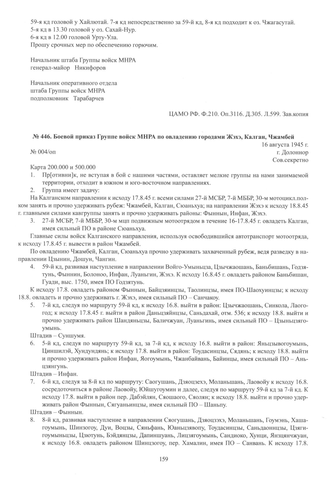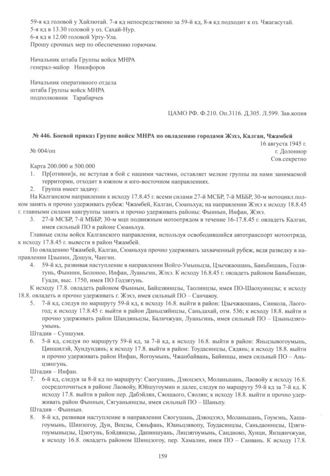 Боевой приказ Группе войск МНРА по овладению городами Жэхэ, Калган, Чжамбей. 16 августа 1945 г. // ЦАМО РФ. Ф. 210. Оп. 3116. Д. 305. Л. 633-634. Зав. копия.