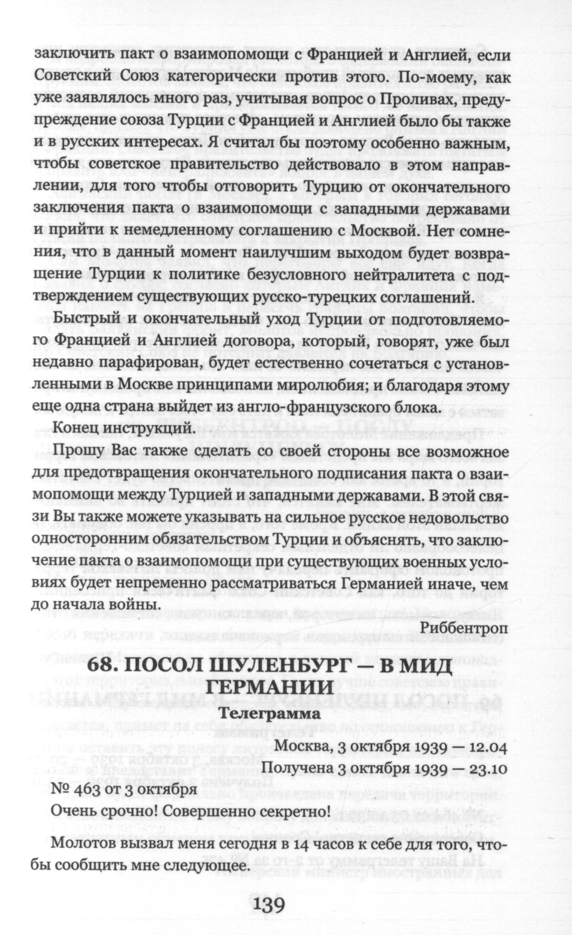 Посол Шуленбург - в МИД Германии. Телеграмма. Москва. 03 октября 1939