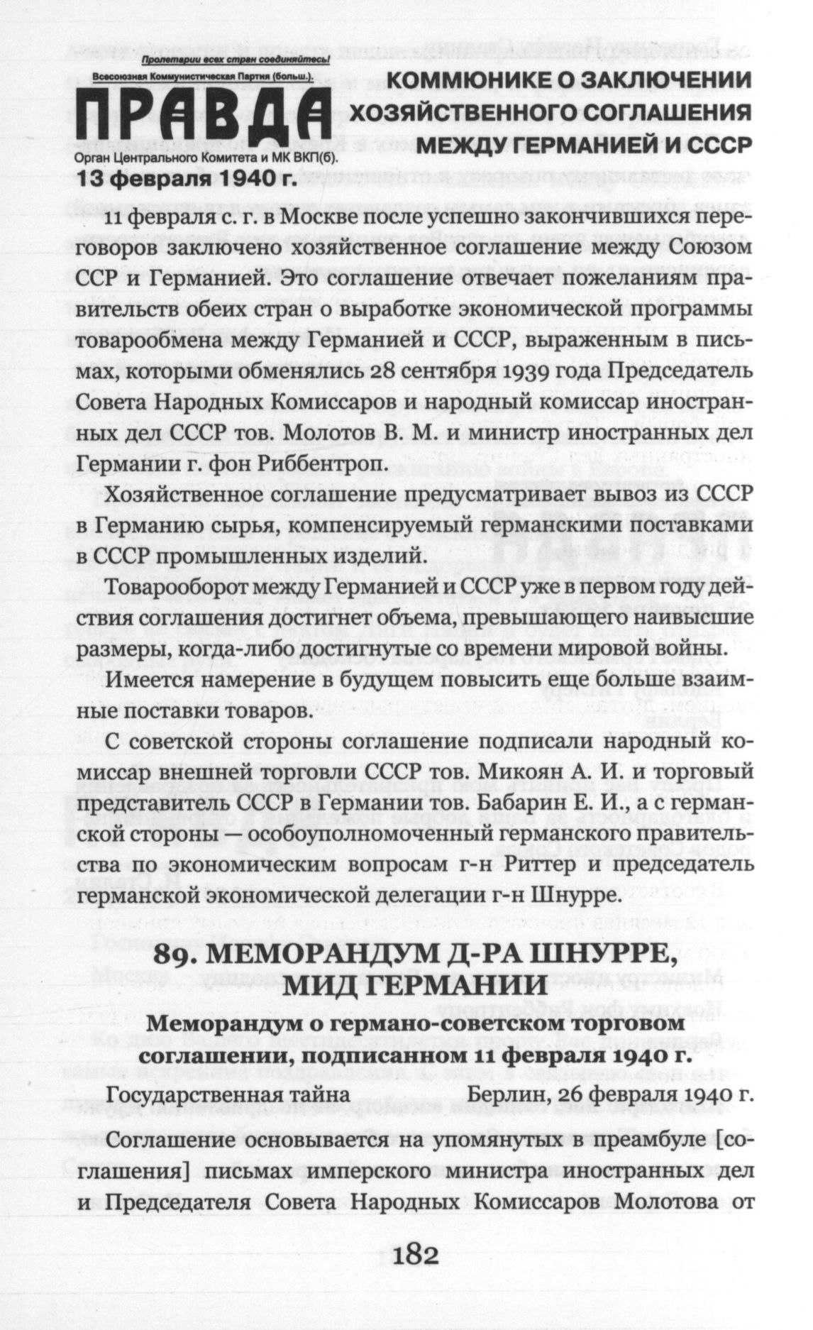 Коммюнике о заключении хозяйственного соглашения между Германией и СССР // Правда. 13 февраля 1940 г.