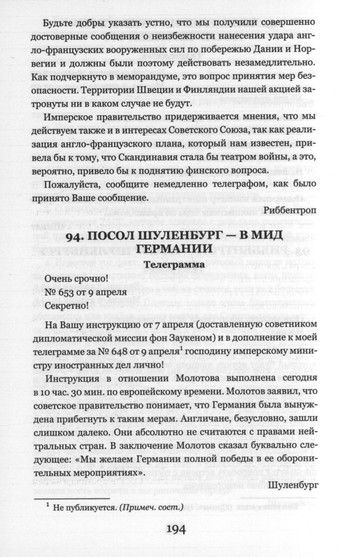 Посол Шуленбург - Риббентропу. Телеграмма. Москва. 9 апреля1940 г.