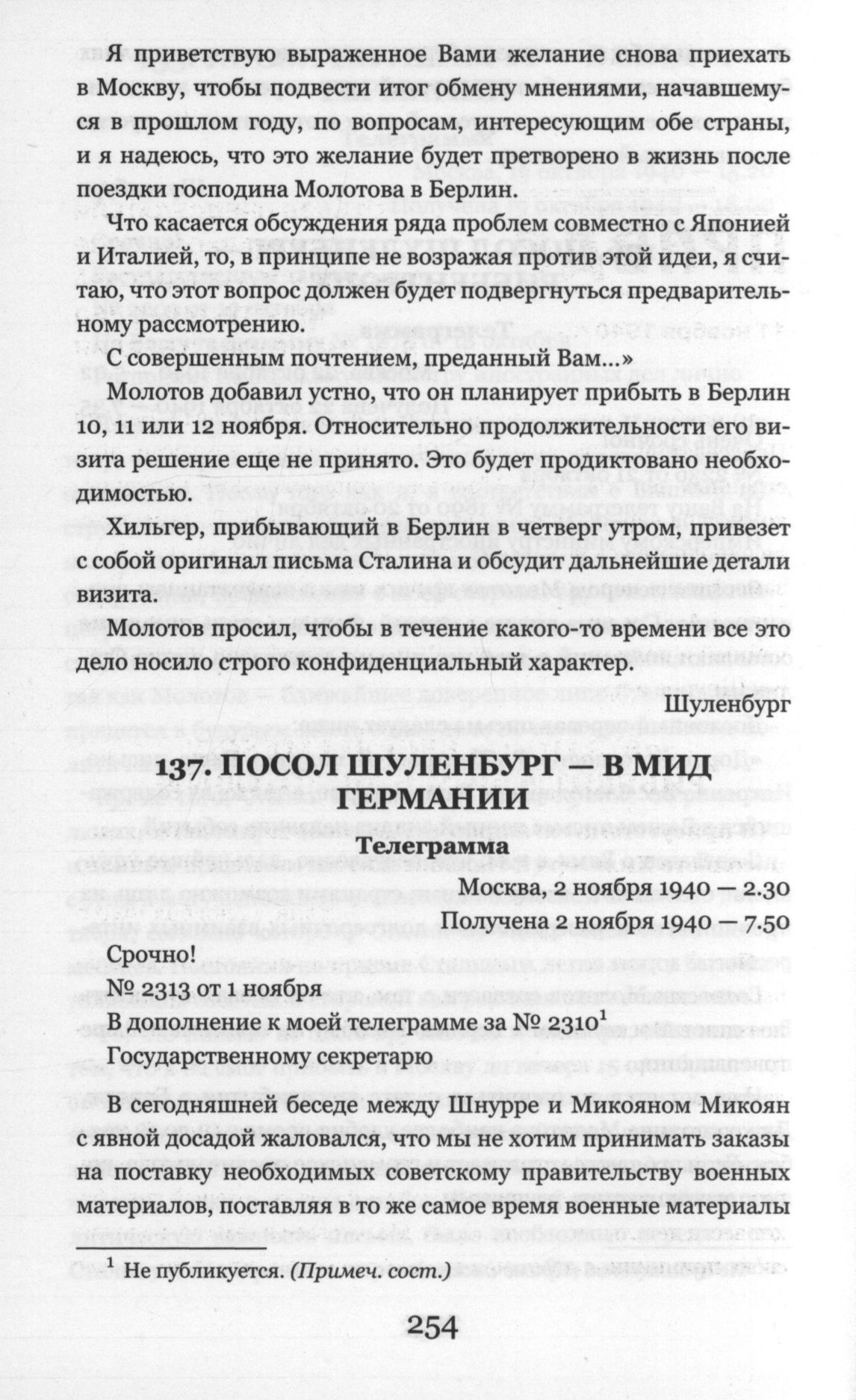 Посол Шуленбург - в МИД Германии. Телеграмма. Москва. 2 ноября 1940 г.