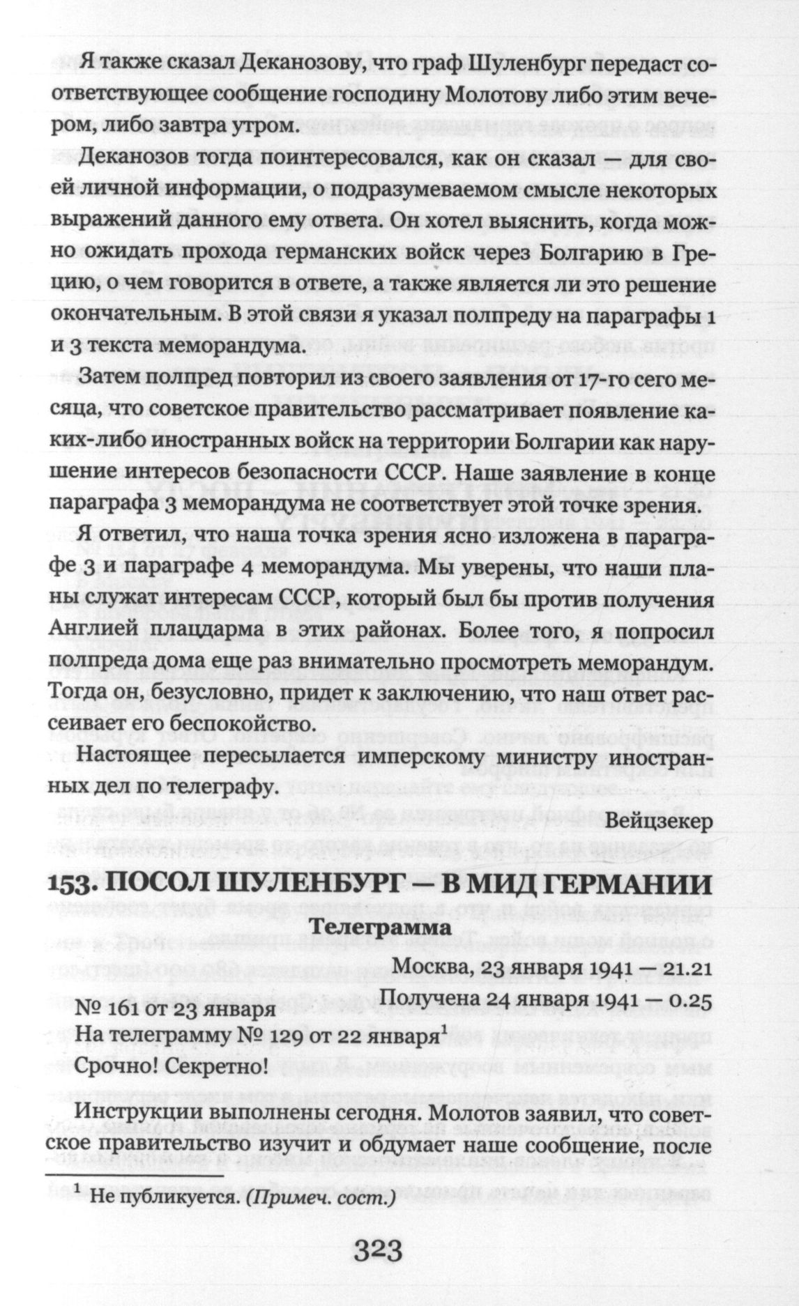 Посол Шуленбург - в МИД Германии. Телеграмма. Москва. 23 января 1941 г.