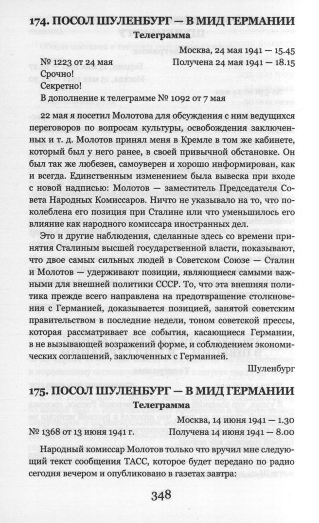 Посол Шуленбург - в МИД Германии. Телеграмма. Москва. 24 мая 1941 г.