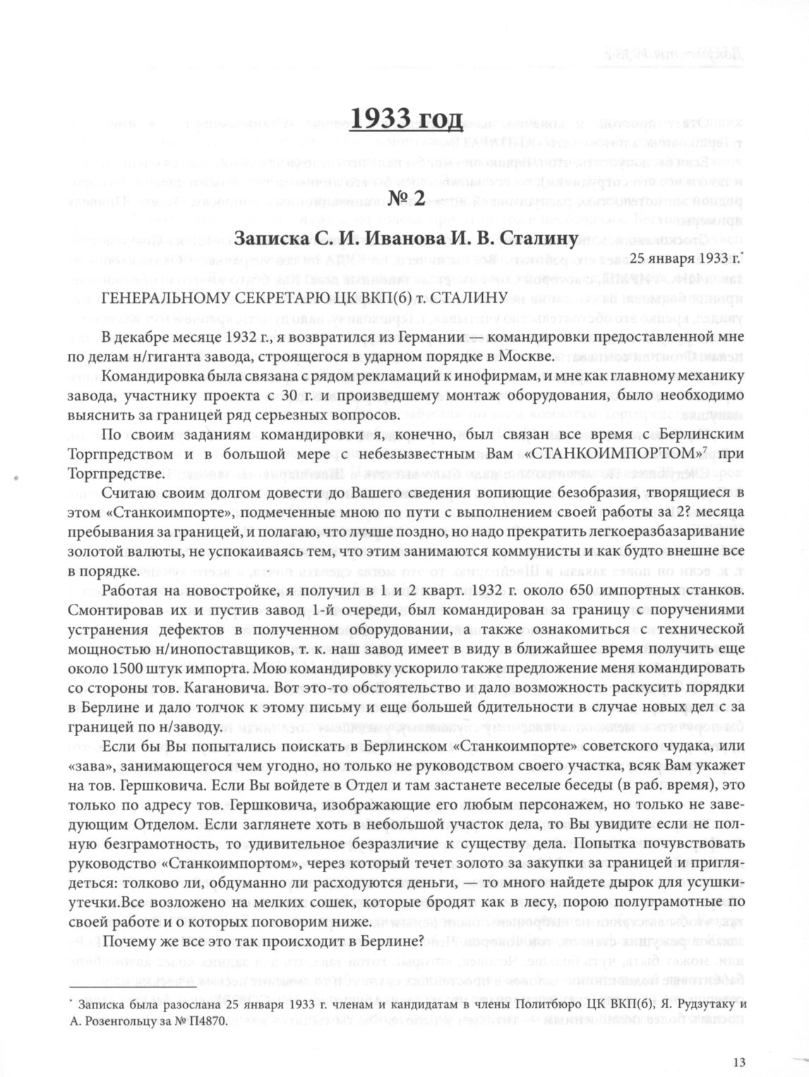 Записка С. И. Иванова И. В. Сталину. 25 января 1933 г. // АП РФ. Ф. 3. Оп. 64. Д. 661. Л. 158-159. Подлинник.
