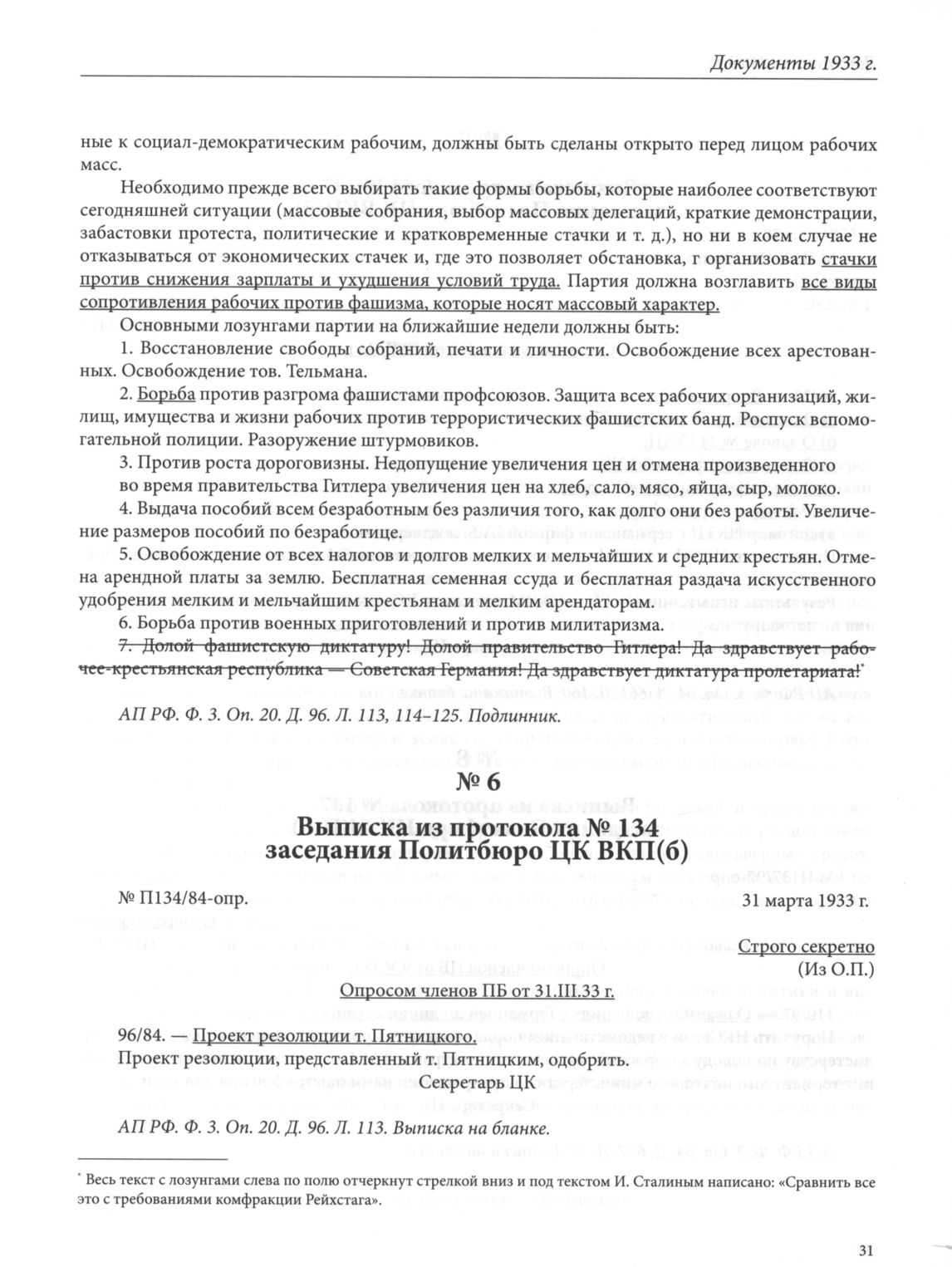 Выписка из протокола № 134 заседания Политбюро ЦК ВКП(б). 31 марта 1933 г. // АП РФ. Ф. 3. Оп. 20. Д. 96. Л. 113. Выписка на бланке.