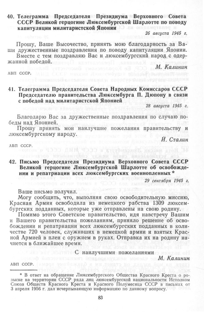 Письмо Председателя Президиума Верховного Совета СССР Великой герцогине Люксембургской Шарлотте об освобождении и репатриации всех люксембургских военнопленных. 29 сентября 1945 г. // АВП СССР.