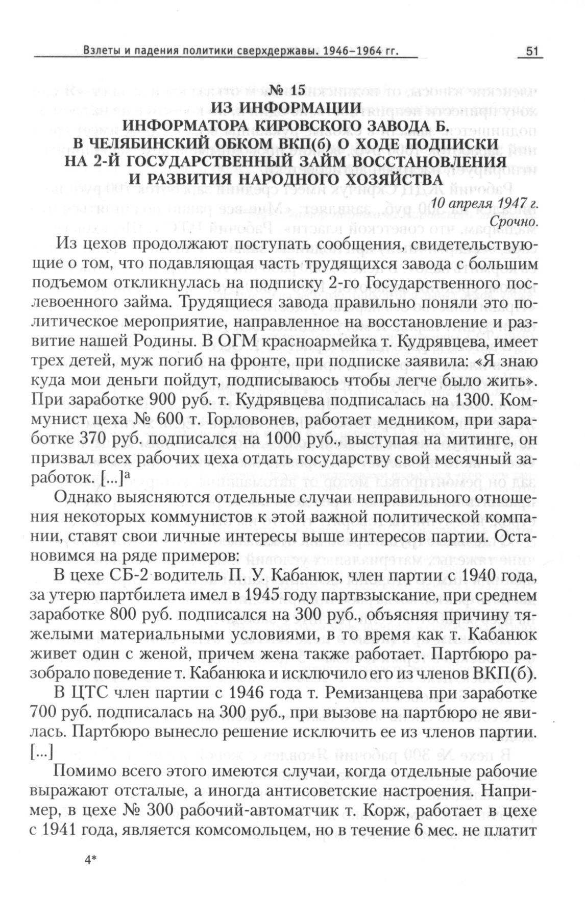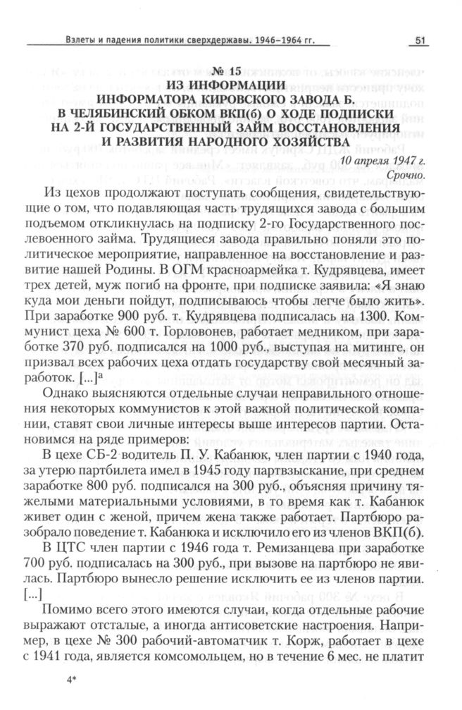 Из информации информатора Кировского завода Б. в Челябинский обком ВКП(б) о ходе подписки на 2-й государственный займ восстановления и развития народного хозяйства, 10 апреля 1947 г. // ОГАЧО, Ф. П-288, Оп. 11, Д. 192, Л. 37-40. Подлинник.