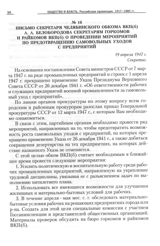 Письмо секретаря Челябинского обкома ВКП(б) А. А. Белобородова секретарям горкомов и райкомов ВКП(б) о проведении мероприятий по предотвращению самовольных уходов с предприятий, 19 апреля 1947 г. // ОГАЧО, Ф. П-288, Оп. 11, Д. 261. Типографский экз.