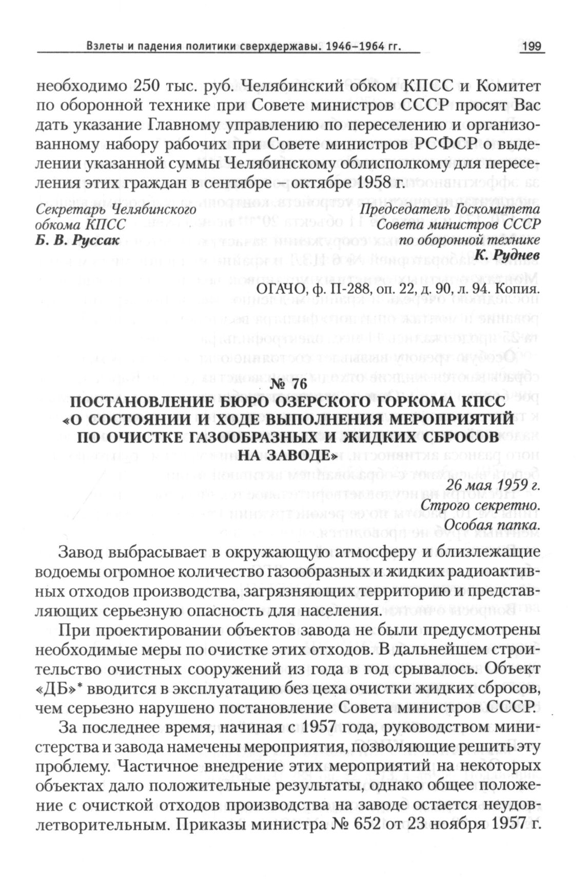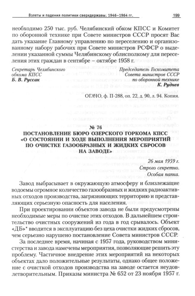 Постановление бюро Озерского горкома КПСС «О состоянии и ходе выполнения мероприятий по очистке газообразных и жидких сбросов на заводе», 26 мая 1959 г. // ОГАЧО, Ф. П-288, Оп. 42, Д. 73, Л. 48-50. Подлинник.