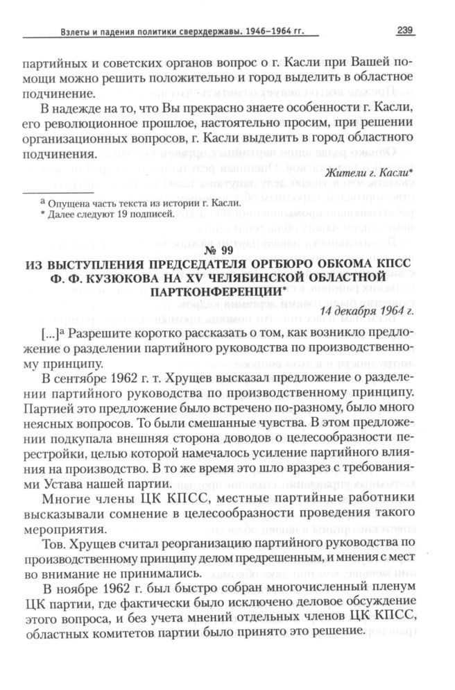Из выступления председателя оргбюро обкома КПСС Ф. Ф. Кузюкова на XV Челябинской областной парт-конференции, 14 декабря 1964 г. // ОГАЧО, Ф. П-288, Оп. 161, Д. 2, Л. 8-14. Подлинник.