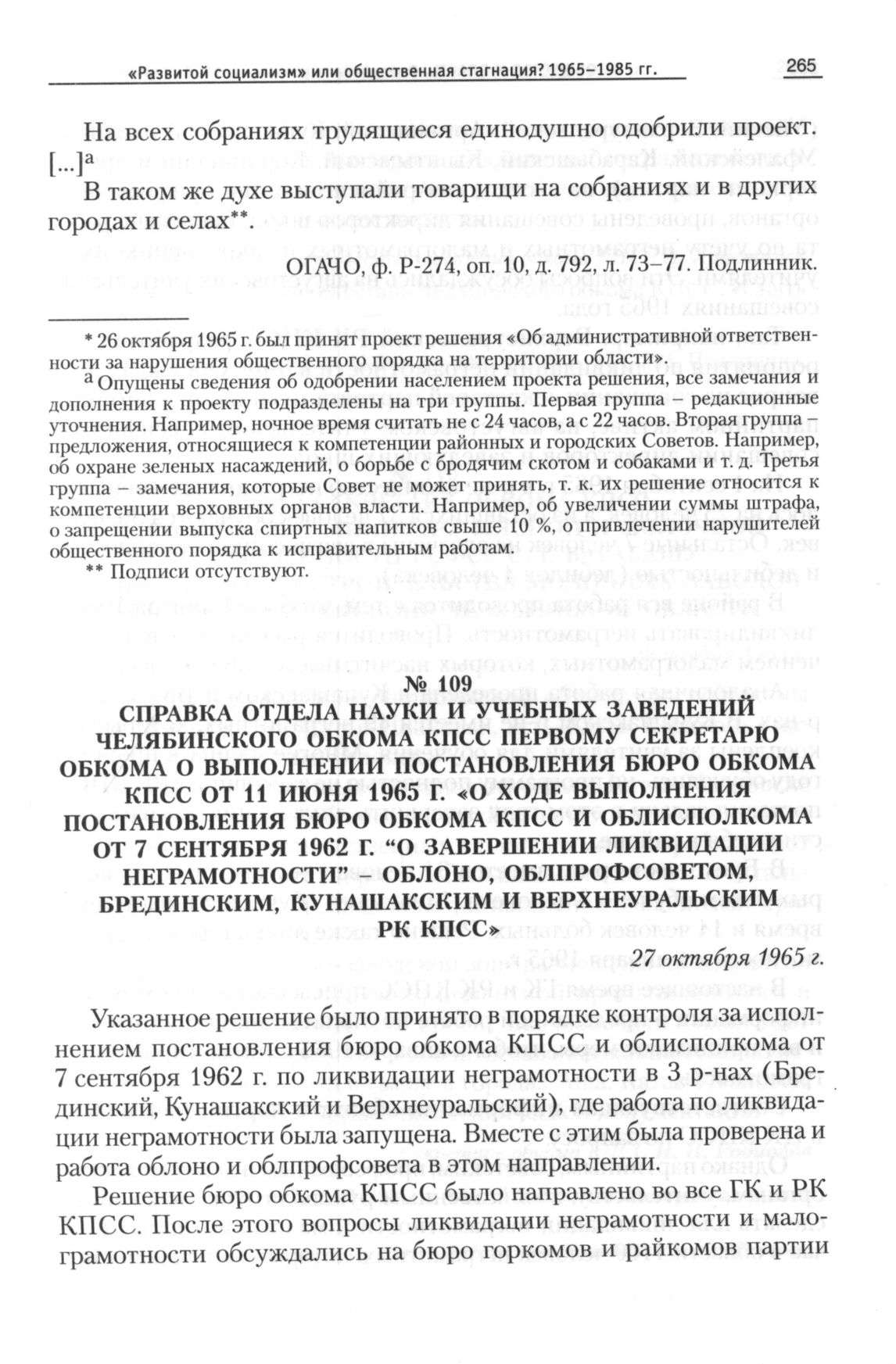 Справка отдела науки и учебных заведений Челябинского обкома партии первому секретарю обкома о выполнении постановления бюро обкома КПСС от 11 июня 1965 г. «О ходе выполнения постановления бюро обкома КПСС и облисполкома от 7 сентября 1962 г. “О завершении ликвидации неграмотности” - облоно, облпрофсоветом, Брединским, Кунашакским и Верхнеуральским РК КПСС», 27 октября 1965 г. // ОГАЧО, Ф. П-288, Оп. 161, Д. 105, Л. 223-224. Подлинник.