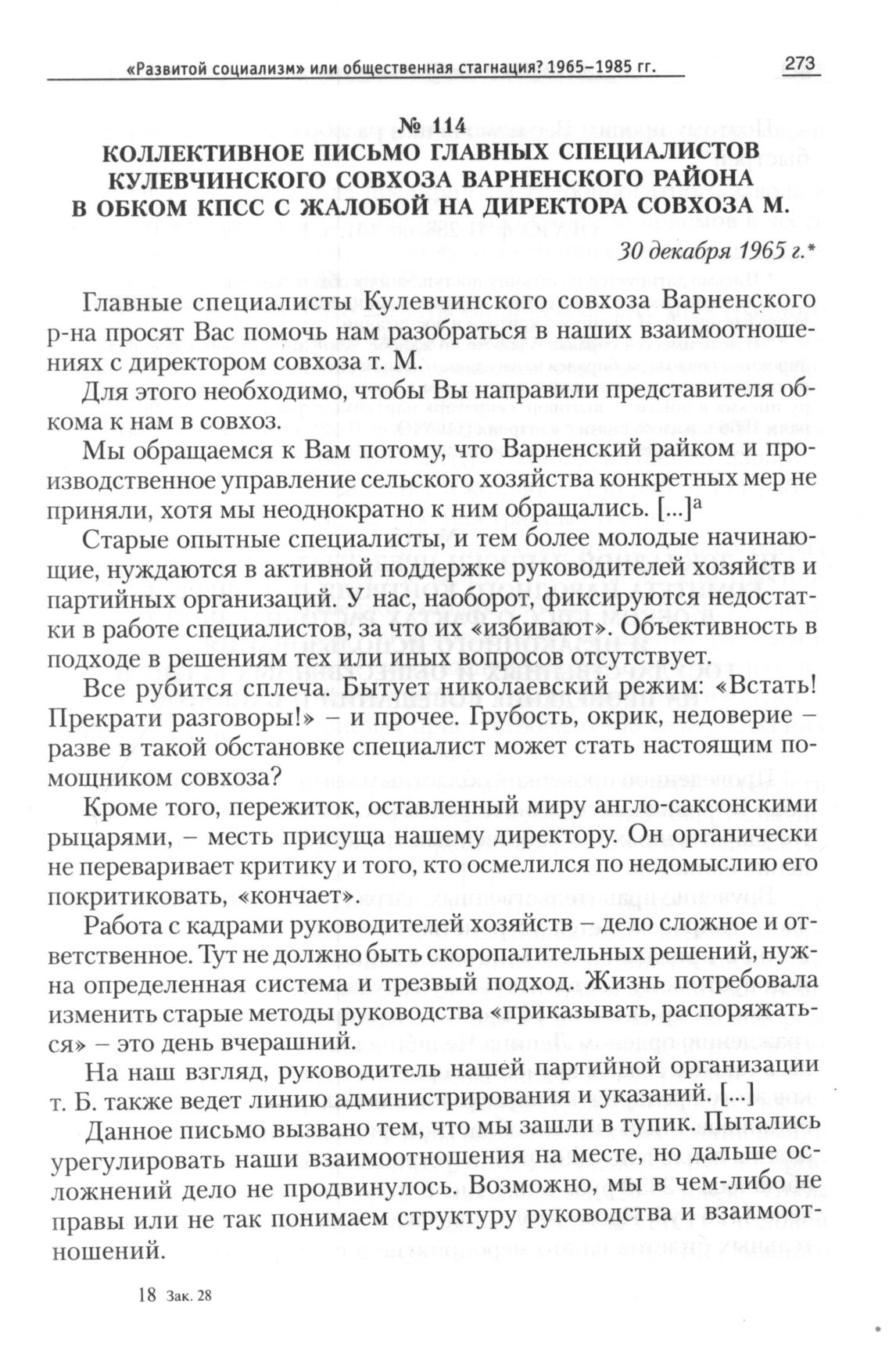 Коллективное письмо главных специалистов Кулевчинского совхоза Варн...
