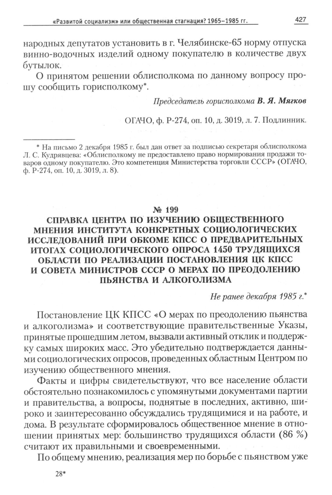 Справка Центра по изучению общественного мнения Института конкретных социологических исследований при обкоме КПСС о предварительных итогах социологического опроса 1450 трудящихся области по реализации постановления ЦК КПСС и Совета министров СССР о мерах по преодолению пьянства и алкоголизма, не ранее декабря 1985 г. // ОГАЧО, Ф. П-288, Оп. 198, Д. 285, Л. 2-5. Подлинник.