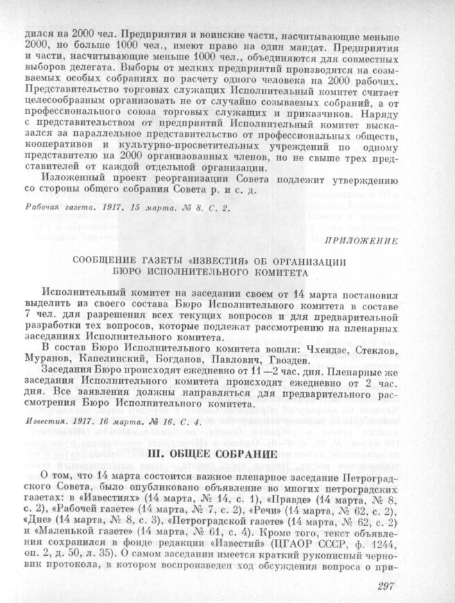 14 марта. III. Общее собрание. 1. Объявление газеты «Известия» об объединенном заседании рабочих и солдатских депутатов // Известия. 1917. 14 марта. № 14. С. 1.