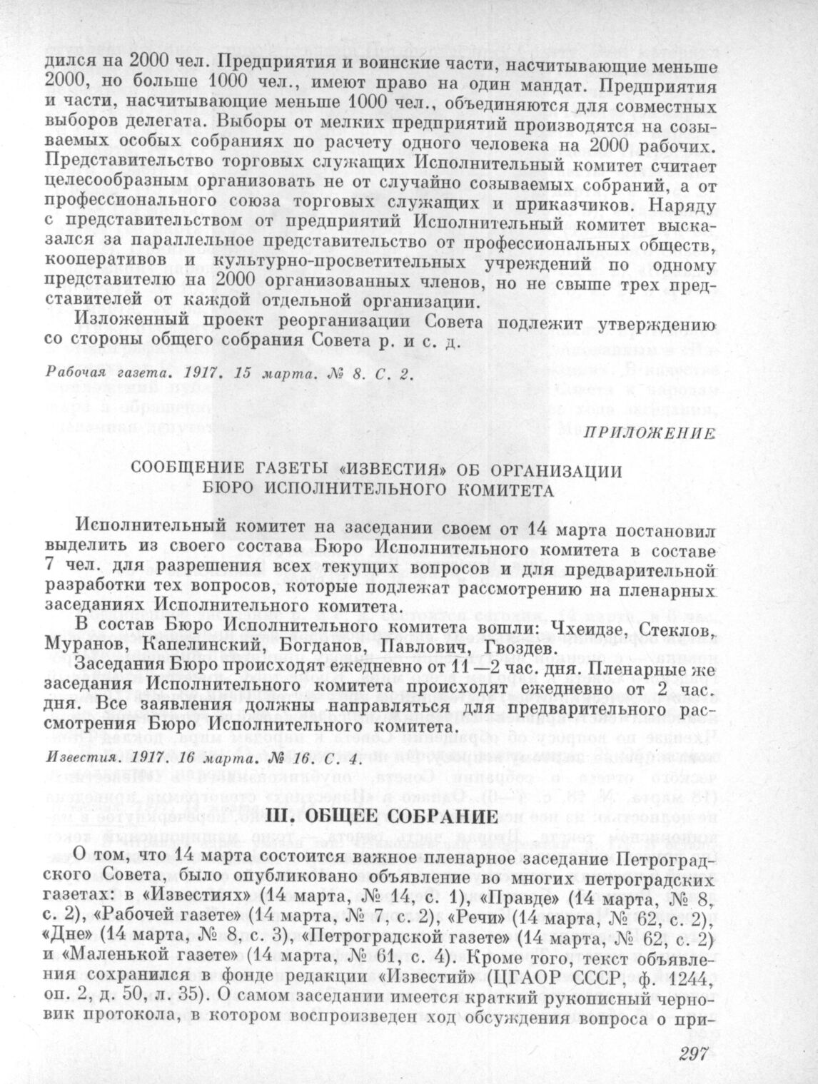 Петроградский Совет рабочих и солдатских депутатов в 1917 году: Протоколы, стенограммы и отчеты, резолюции, постановления общих собраний, собраний секций, заседаний Исполнительного комитета и фракций (27 февраля — 25 октября 1917 года). Т. 1 (27 февраля — 31 марта 1917 года). — Л.: Наука. Ленингр. отд-ние, 1991.