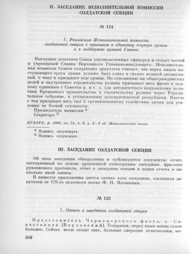 24 марта. III. Заседание солдатской секции. 1. Отчет о заседании солдатской секции // ЦГАОРЛ, Ф. 1000, Оп. 73, Д. 17, Л. 4—38. Машинописная копия. Опубл.: Матвеев Ф. П. С. 182—203.
