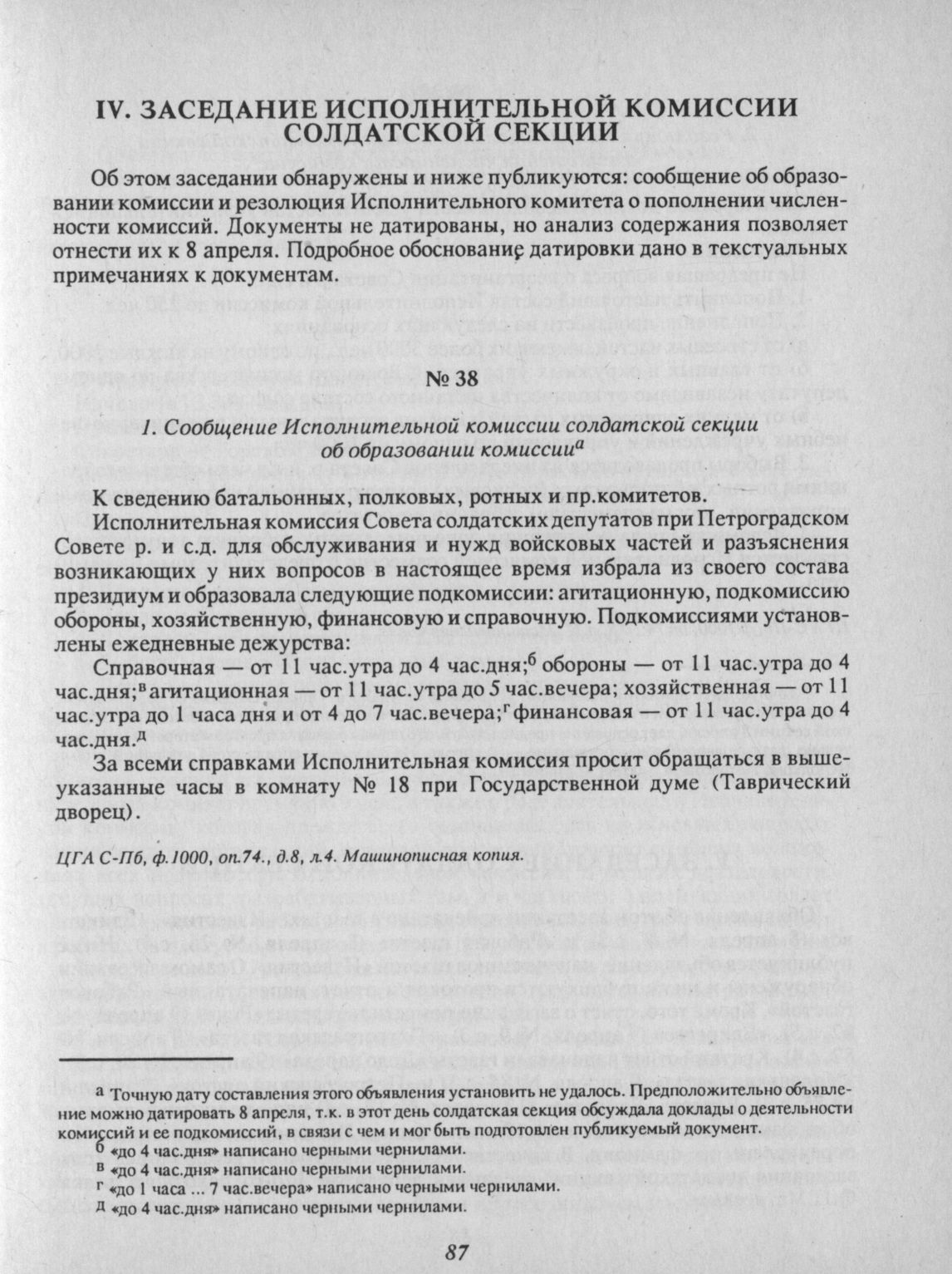 8 апреля. IV. Заседание Исполнительной комиссии солдатской секции. 1. Сообщение Исполнительной комиссии солдатской секции об образовании комиссии // ЦГА С-Пб, Ф. 1000, Оп. 74, Д. 8, Л. 4. Машинописная копия.